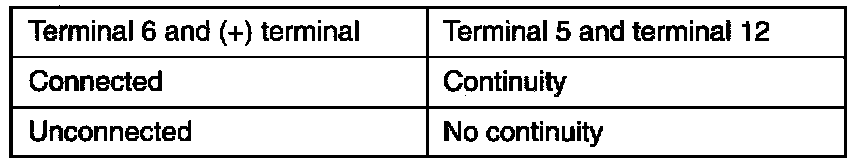 1. Connect the negative (-) terminal of the 1.5 V power supply to terminal 5 of the ignition power transistor; then check whether there is continuity between terminal 5 and terminal 12 when terminal 6 and the positive (+) terminal are connected and disconnected.