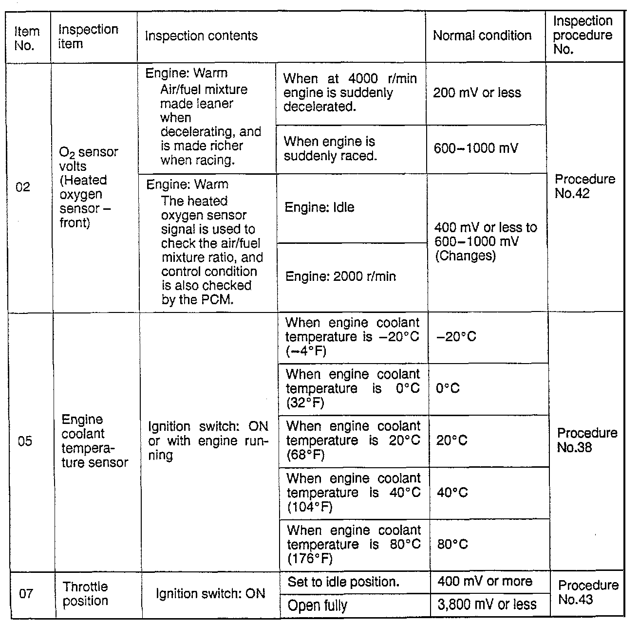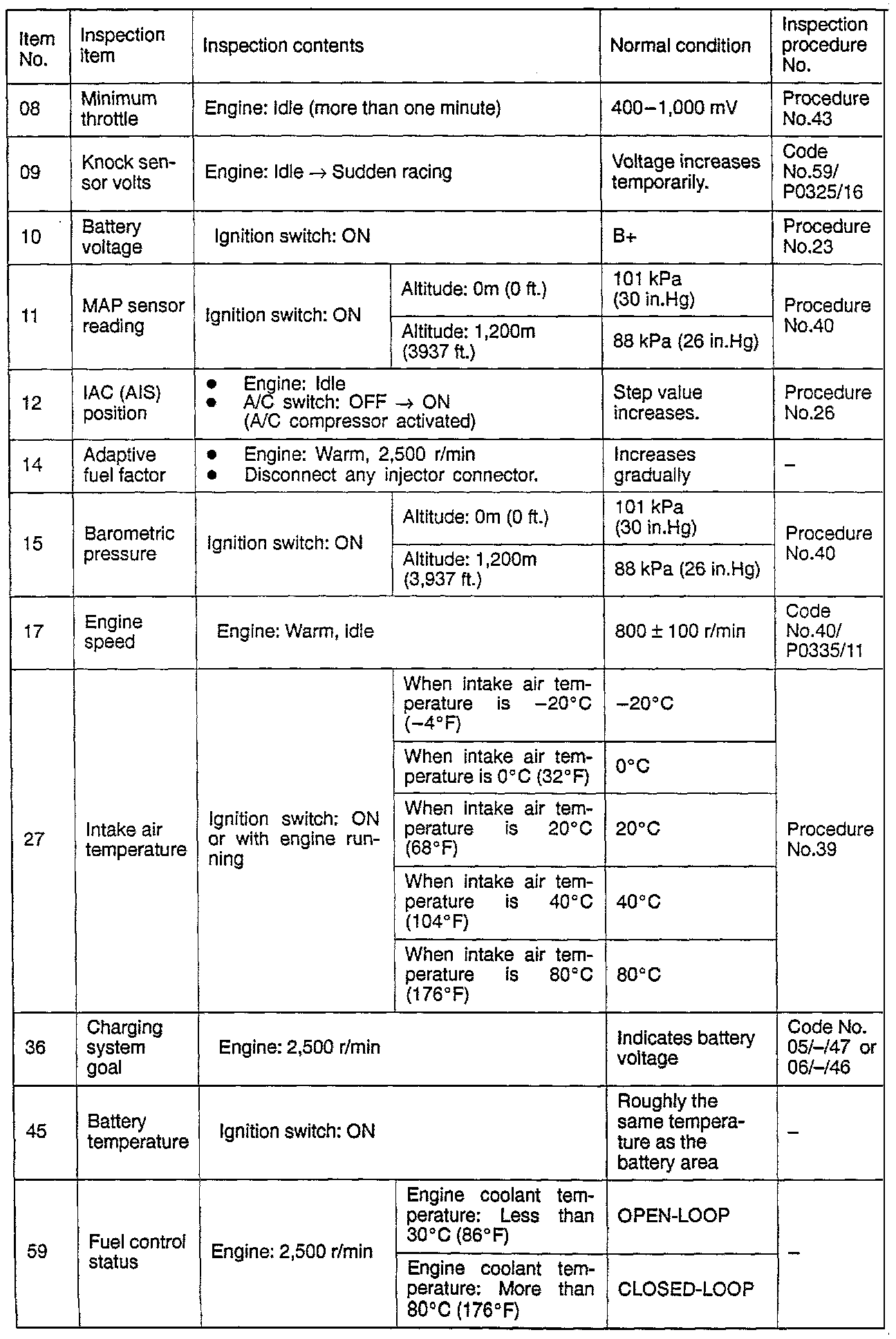 Sensor Read Tests Reference Table