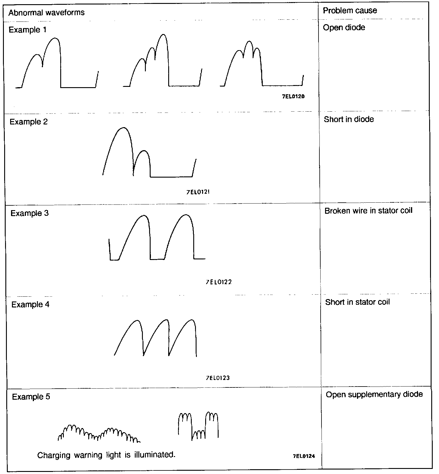 2. Identification of abnormal waveforms is easier when there is a large output current (regulator is not operating). (Waveforms can be observed when the headlights are illuminated.)