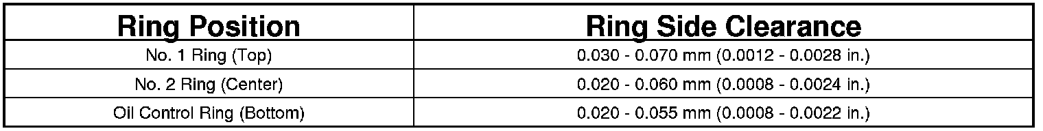 5. Measure the ring side clearance as shown. Make sure the feeler gauge (1) fits snugly between the ring land and the ring. Replace any ring not within specification.