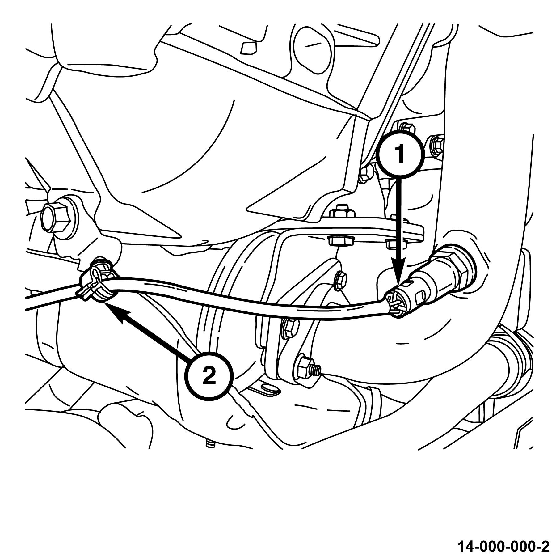 3. Engage the downstream oxygen sensor wire harness to the retainers (2).