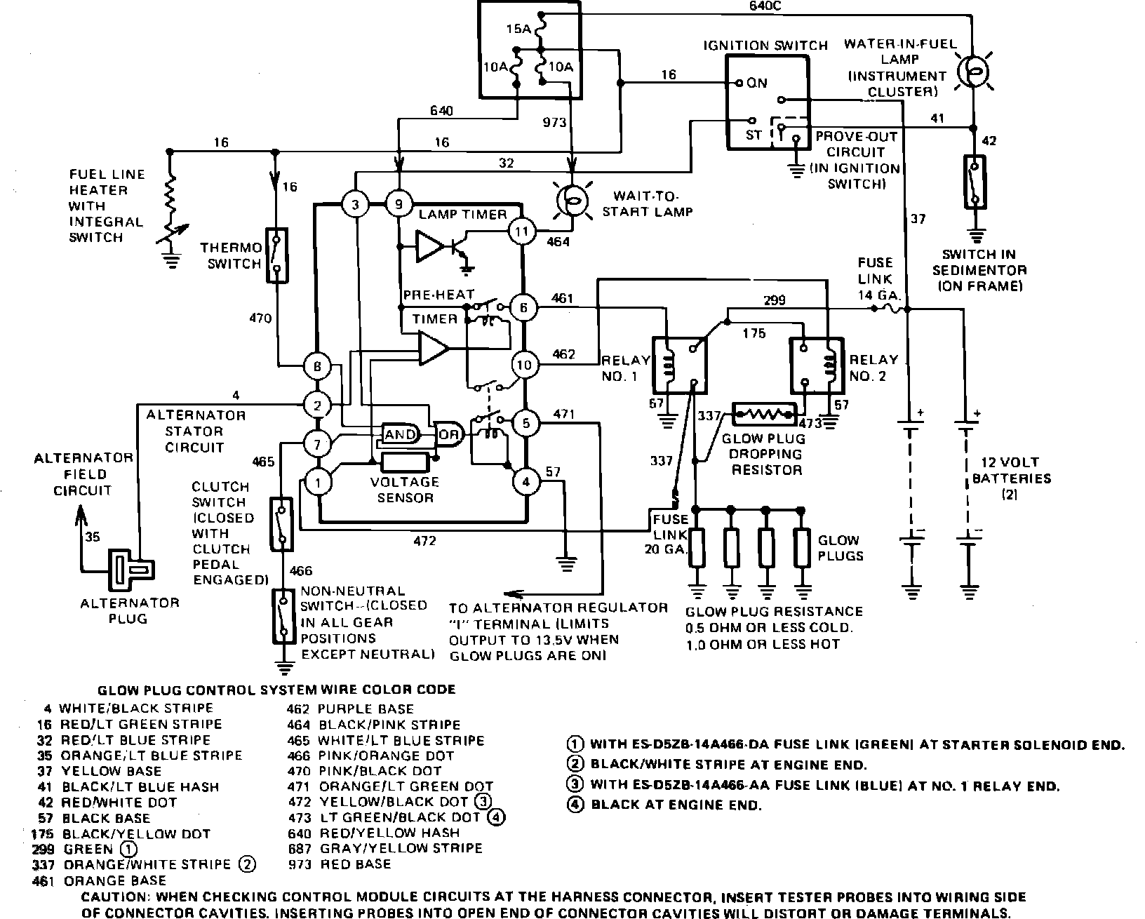 10. Connect a suitable 12 volt test lamp between No. 2 glow plug relay signal terminal and ground. Observe test lamp with transmission in Neutral and ignition in Run. If test lamp lights, proceed to step 11. If test lamp does not light, repair open or short in circuit 462 and recheck.