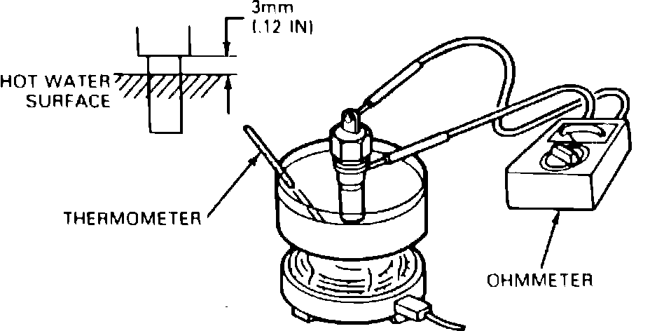 8. Remove engine coolant temperature sensor from engine and place sensor in a container of water as shown in Fig. 3. Bring water to a temperature of 68° F, then check resistance of sensor. If resistance is between 2800---3800 ohms, repair circuit between GPCM pin No. 13 and coolant temperature sensor and repeat test. If resistance is not between 2800---3800 ohms, replace sensor and repeat test.