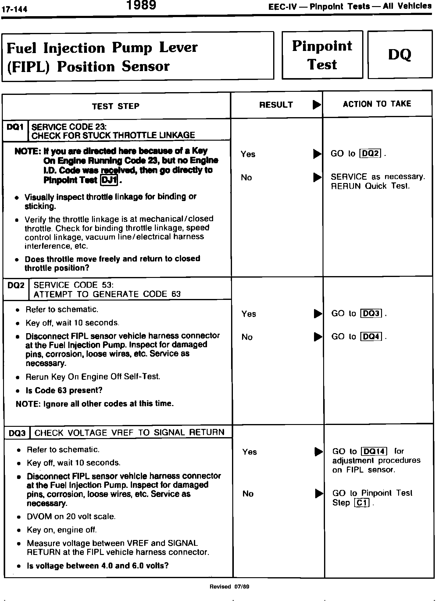 Previously the DQ Pinpoint Test instructed the technician to service the Fuel Injection Pump Lever (FIPL) sensor when a Self-Test Code 23 was received while performing the Key On Engine Running Self-Test (KOER).