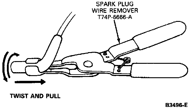 REMOVAL1. Remove spark plug wires from spark plugs with Spark Plug Wire Remover T74P-6666-A, pulling outward on the boot with a slight side-to-side twist. Do not pull on the spark plug wire set.