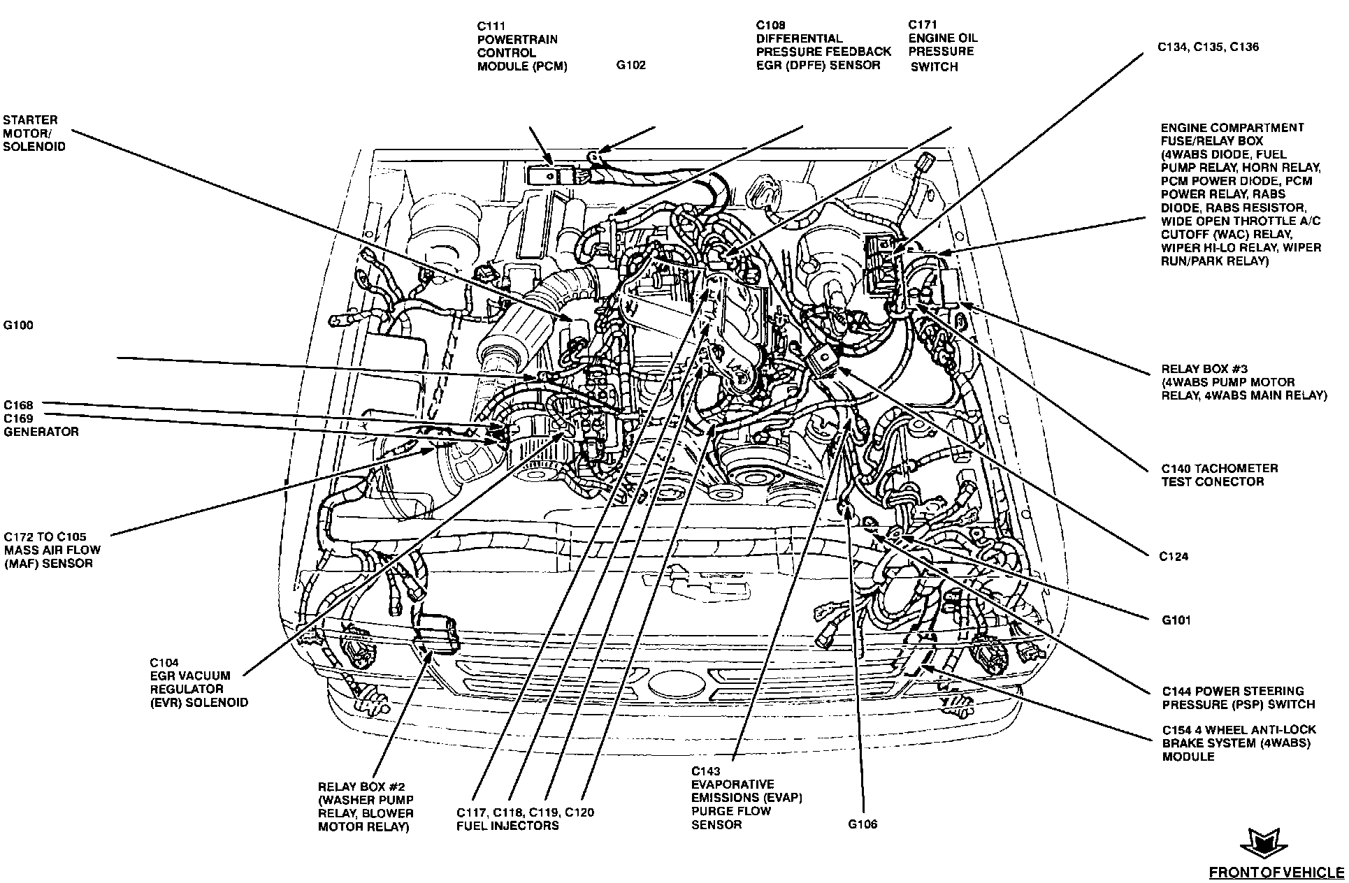 Control Module C154 is mounted in front and to the right of the battery on the radiator support sheet metal. It is held in place by a screw and a tab.