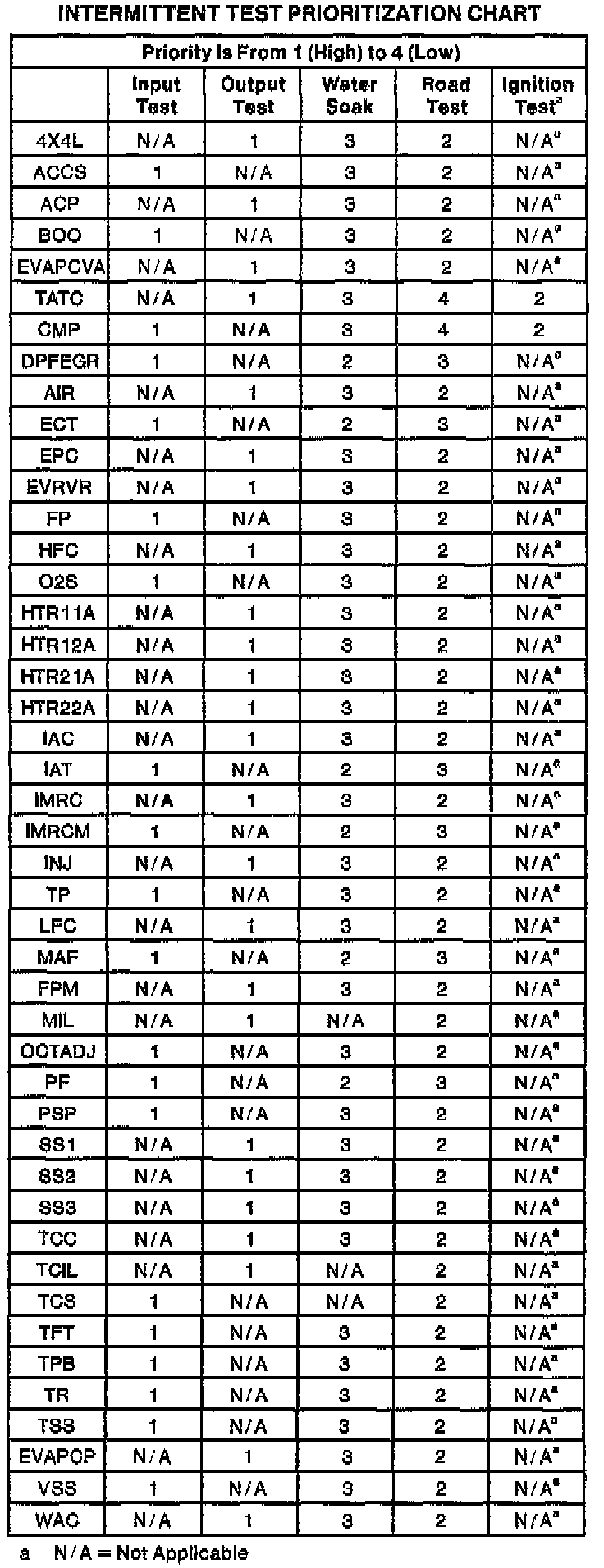 Use this chart to choose which Intermittent Test to run for the circuit or component. If the vehicle is a no-start, the ignition test should be run first.