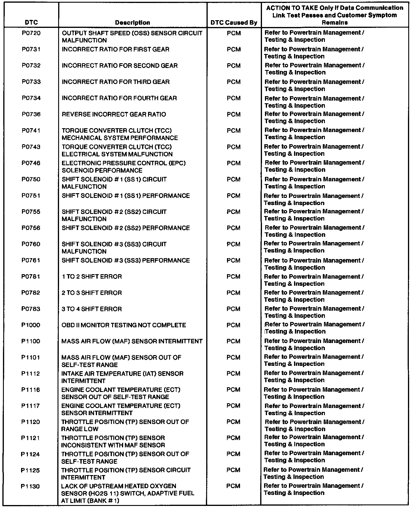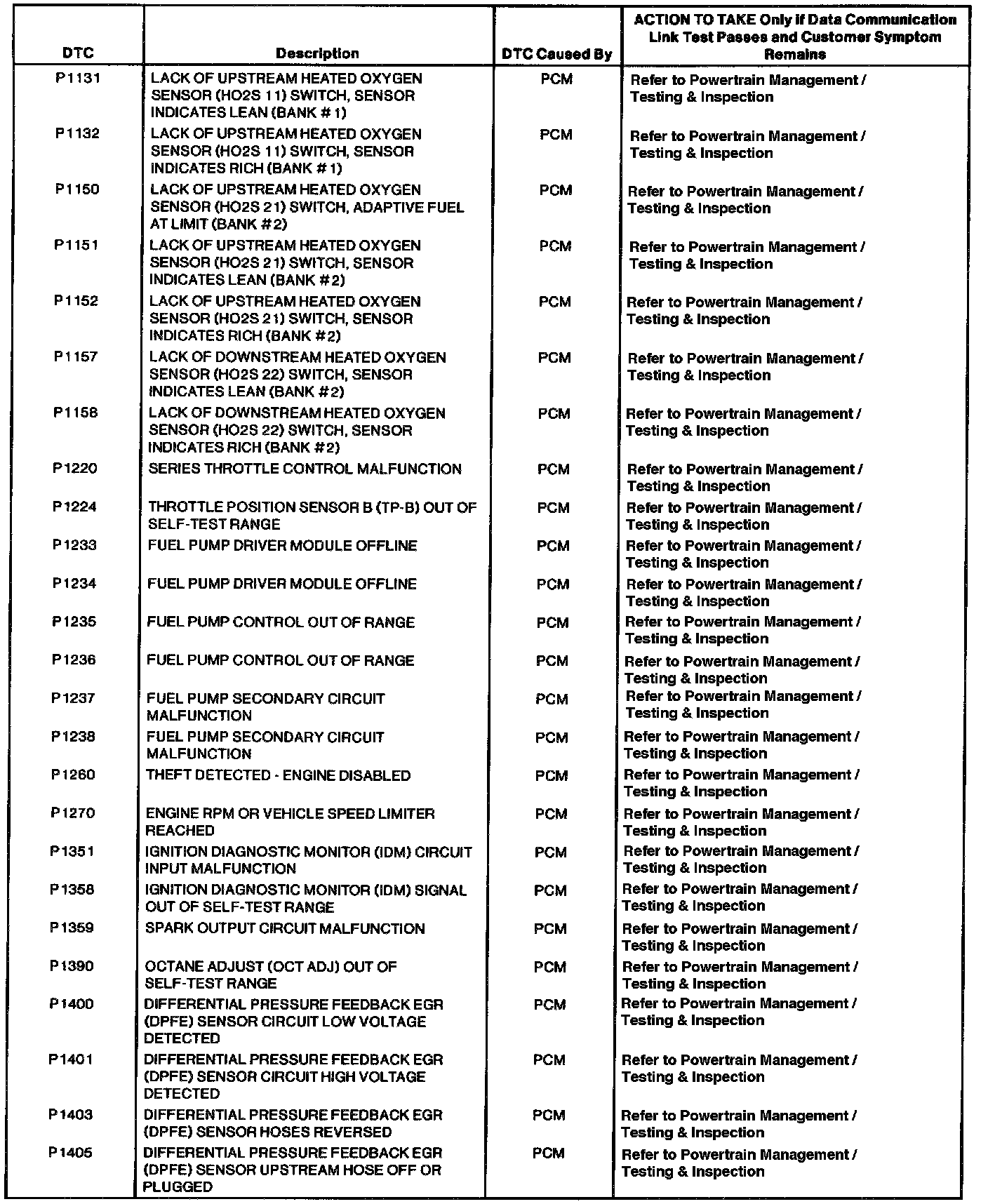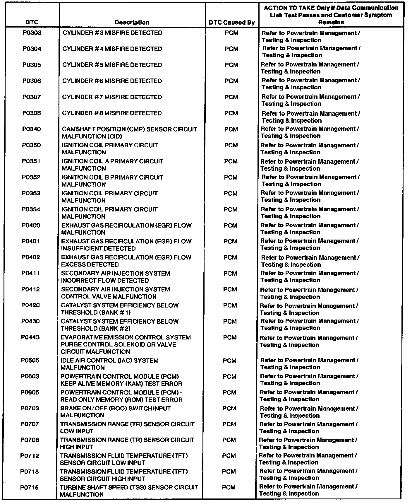 Powertrain Control Module DTC Index