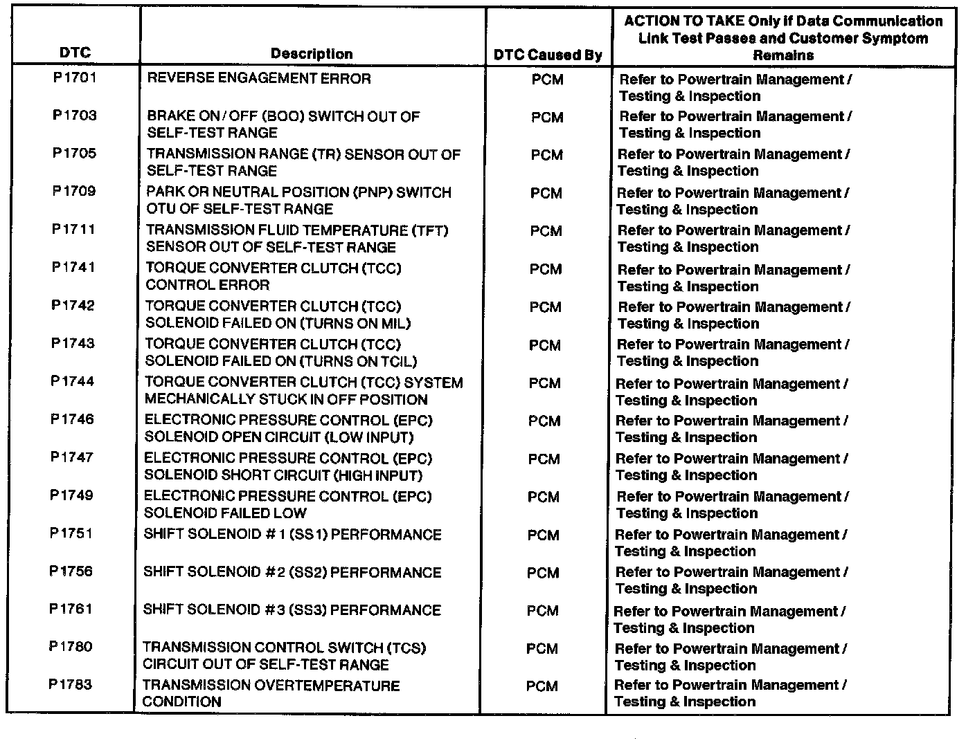 DTCs P1701 - P1783