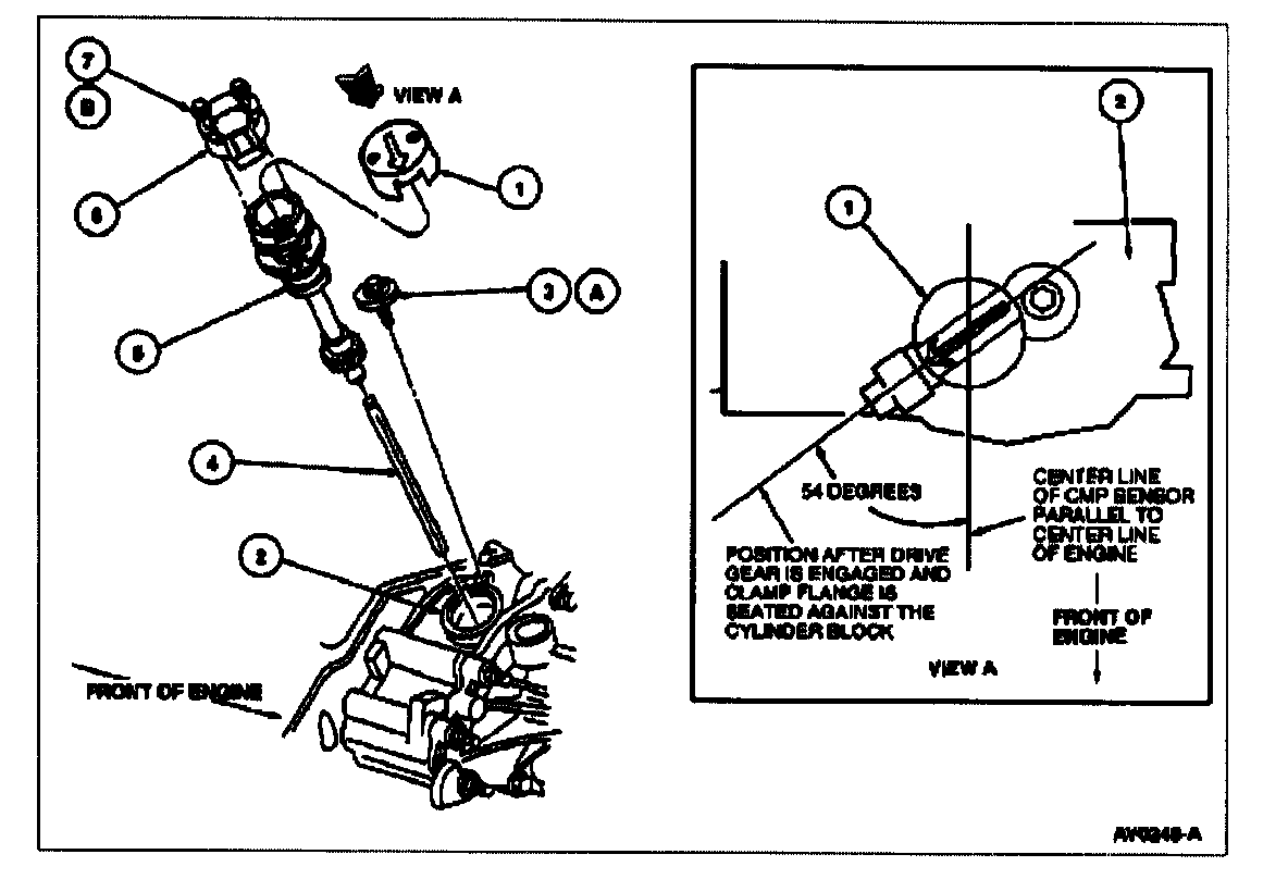 3. Install camshaft position sensor housing so drive gear engagement occurs when arrow on locator tool is pointed approximately as shown in the illustrations. This step will locate camshaft position sensor electrical connector in the pre-removal position.