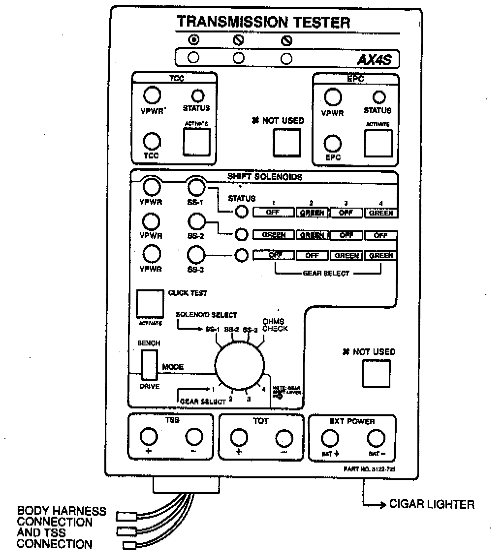 ROTUNDA TRANSMISSION TESTERUse Rotunda Transmission Tester 007-00085 with AX4S Update Kit 007-00087 or equivalent to diagnose electronically controlled transaxles. The following instructions outline the set-up and use of this tester in the pinpoint tests for the AX4S.