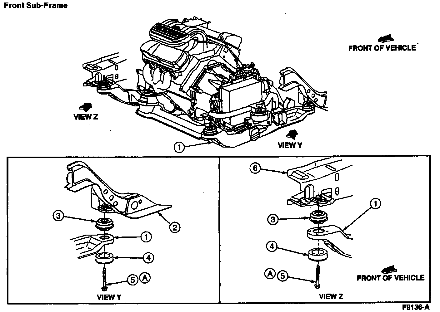 19. Support front sub-frame with Rotunda Hi-Lift Jack 014-00942 and Rotunda Sub-Frame Removal Kit 014-00751 or equivalent.