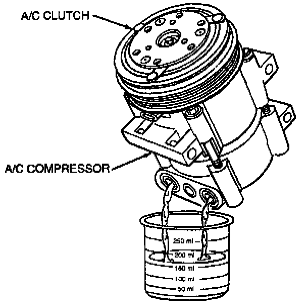 - If the amount of refrigerant oil drained from the old A/C compressor is less than 85 ml (3 ounces), pour 85 ml (3 ounce) of clean refrigerant oil into the new A/C compressor.