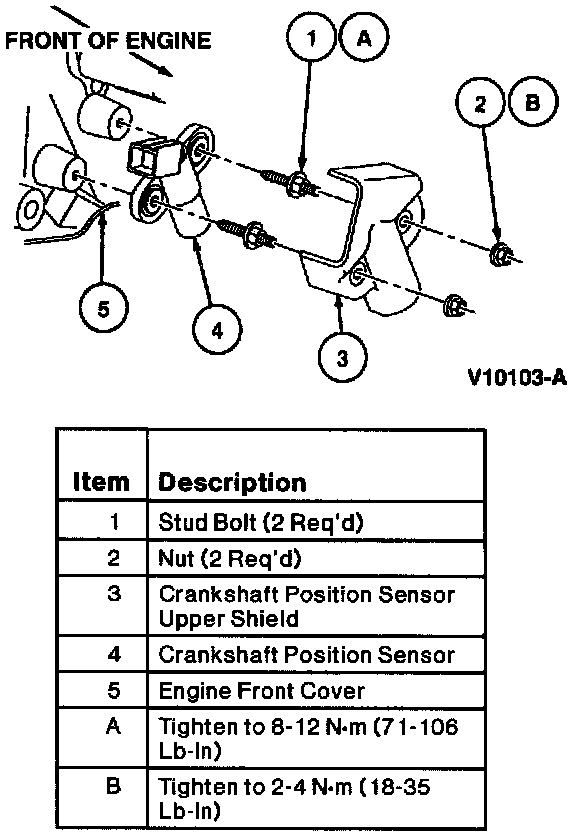 4. Remove crankshaft position sensor shield, stud bolts and remove crankshaft position sensor from the engine front cover.