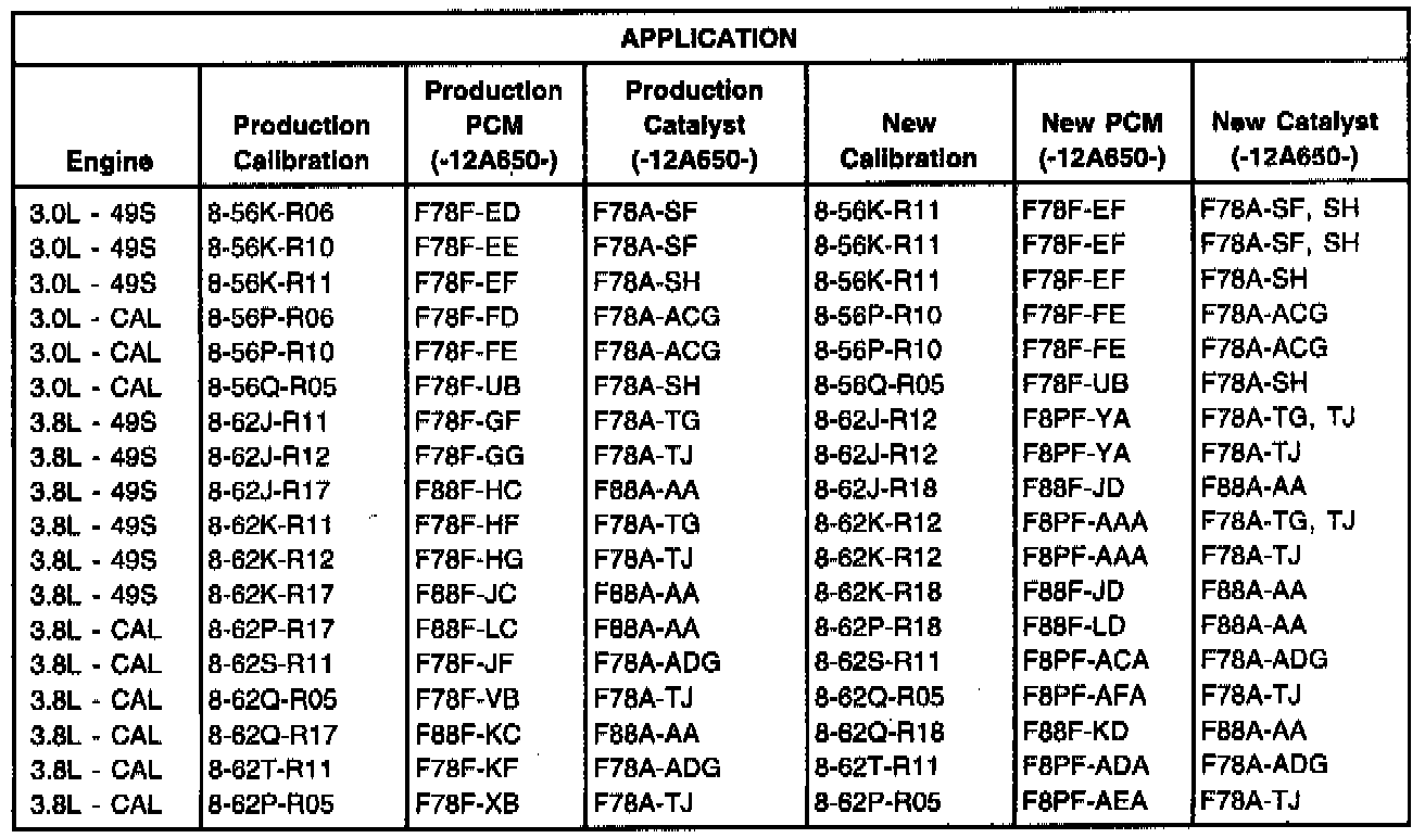 Refer to the Application Chart for the correct PCM, calibration and catalyst to use when servicing the vehicle.