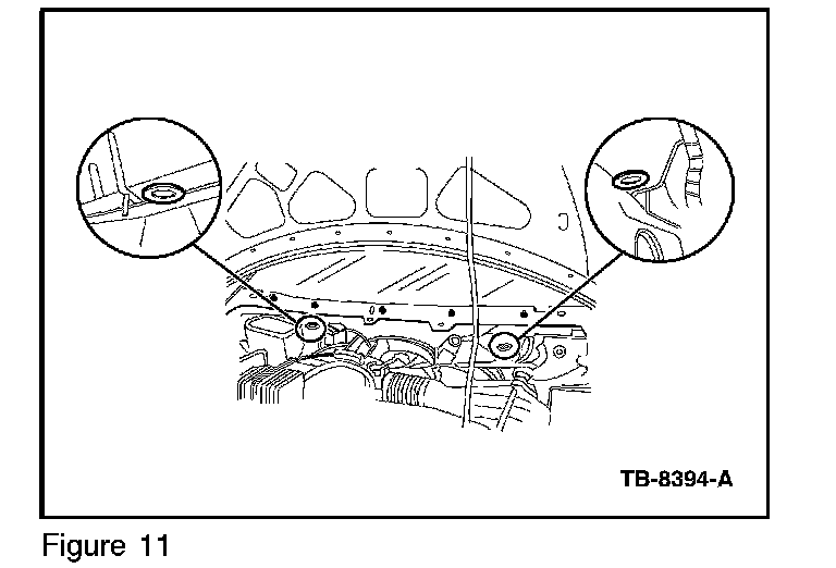 14. Remove and discard the two rubber plugs on the bottom of the cowl sheet metal. (Figure 11)