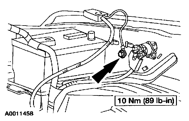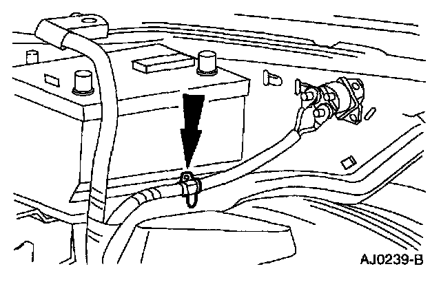 4. Remove the pill-type retainer retaining the battery cable harness to the battery tray.