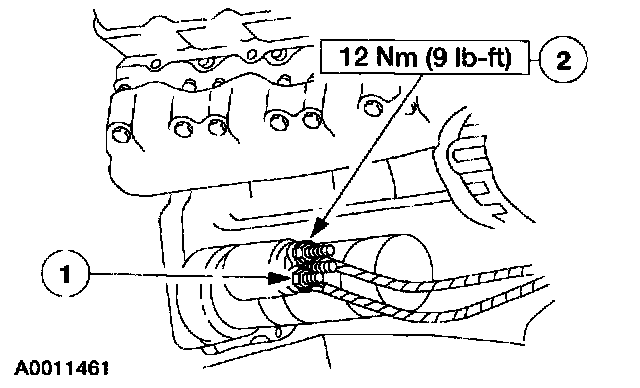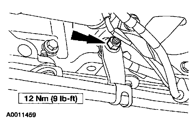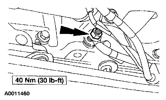 7. Remove the nut located on the engine block right above the oil pan rail. Pull the transmission line bracket off of the stud.