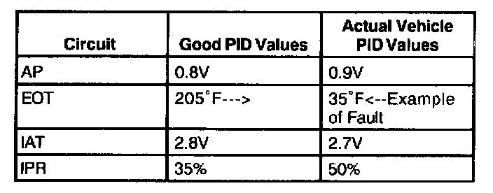 4. Table Format: Scroll through the PID data while analyzing the information. Look for sudden drops or spikes in the values. (Refer to the AP example or reference the EEC-V charts and graphs.)