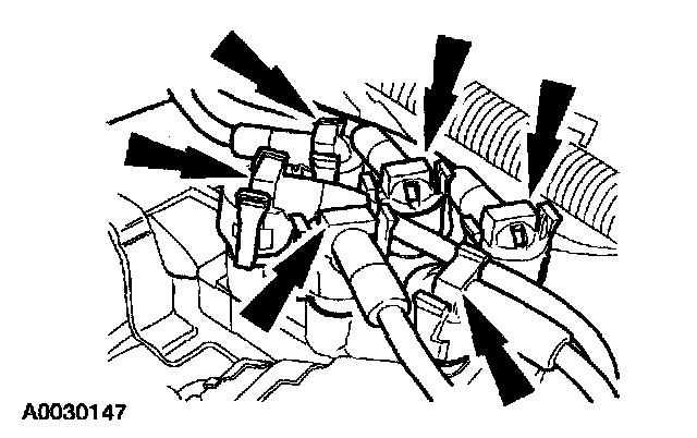 2. Squeeze the locking tabs and twist while pulling upward to remove the spark plug wires from the ignition coil.