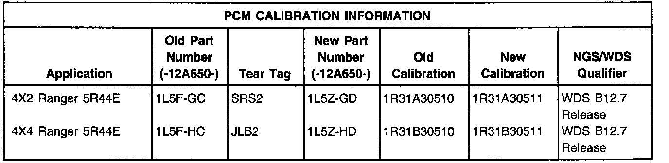 4. If the condition is still present or returns after repair, the PCM must be reprogrammed. Refer to the PCM Calibration Information Chart shown.