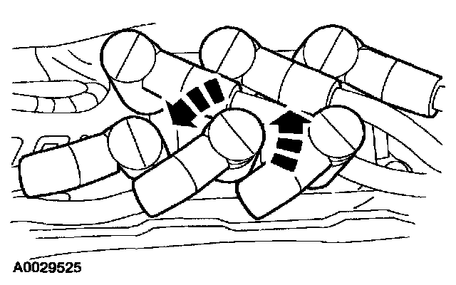 CAUTION: Correct installation of the spark plug wires is critical to vehicle operation. If one spark plug wire is not correctly installed on the spark plug or ignition coil, both spark plugs connected to that segment of the ignition coil may not fire under load.