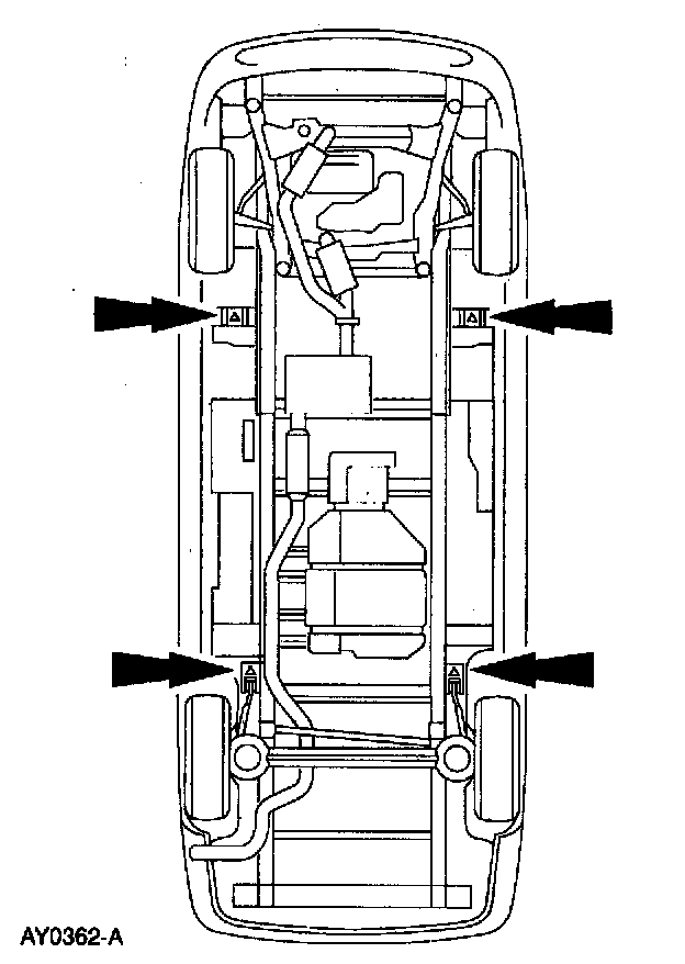 WARNING: ALL FOUR HOIST CONTACT POINTS MUST CONTACT THE DESIGNATED VEHICLE LIFTING LOCATIONS, IDENTIFIED BY A TRIANGLE STAMPED IN THE UNIBODY SHEET METAL. USING OTHER AREAS TO LIFT THE VEHICLE MAY CAUSE DAMAGE TO THE VEHICLE OR PERSONAL INJURY. FAILURE TO FOLLOW THESE INSTRUCTIONS MAY RESULT IN PERSONAL INJURY.