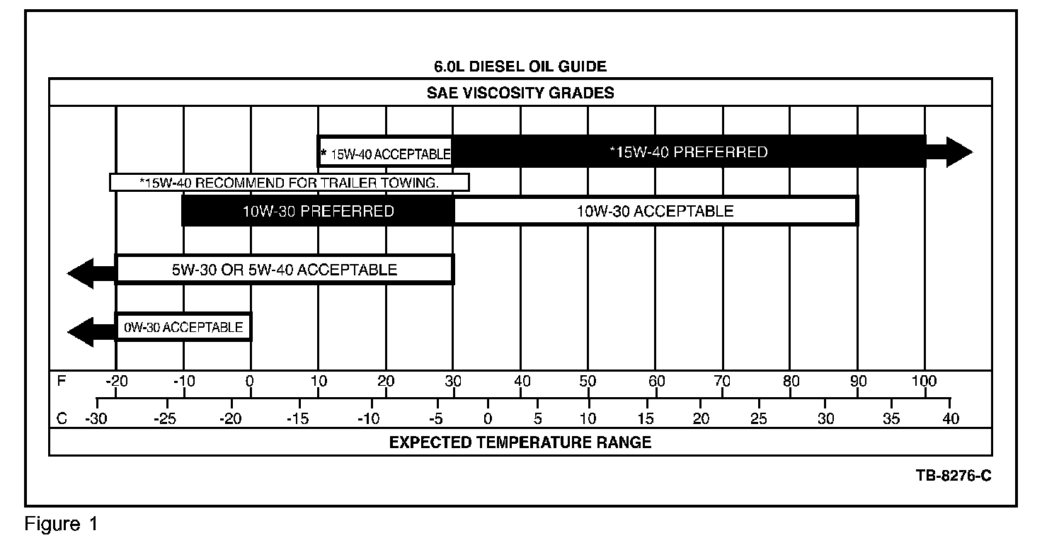 Refer to the oil viscosity chart provided in this TSB. It has been updated and is recommended for all 6.0L DI Diesel model years. Apply the vehicle operating conditions to the oil viscosity chart and select the appropriate viscosity oil grade. Use Motorcraft or equivalent oil conforming to Ford specification WSS-M2C171-D or API service categories CI-4 PLUS, CI-4/SL or DHD-1. If CI-4 PLUS oil is not available, CH-4 is acceptable.
