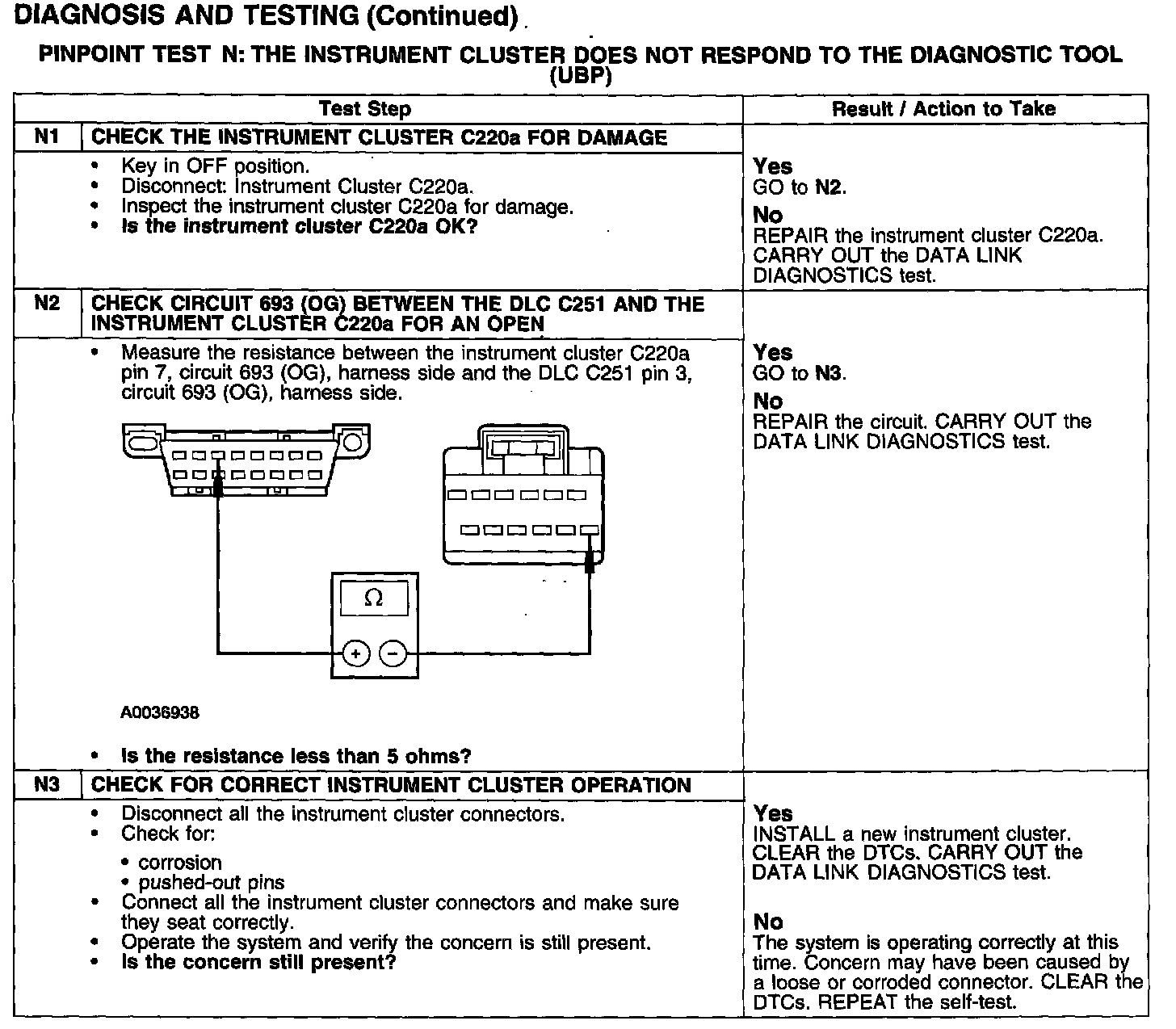 PINPOINT TEST N: THE INSTRUMENT CLUSTER DOES NOT RESPOND TO THE DIAGNOSTIC TOOL (UBP)