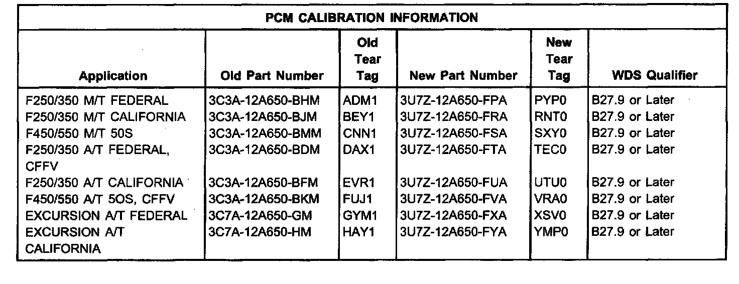This updated service calibration addresses a number of vehicle driveability conditions. When servicing 2003-2004 Super Duty and Excursion vehicles equipped with 6.0L Power Stroke engine built before 9/29/03 (can be verified by the Injection Control Pressure (ICP) sensor located at the rear of the engine) reprogram the PCM/TCM/FICM modules to the latest calibration level (B27.9) or later. This calibration should only be installed on customer vehicles that exhibit one of the conditions addressed above.