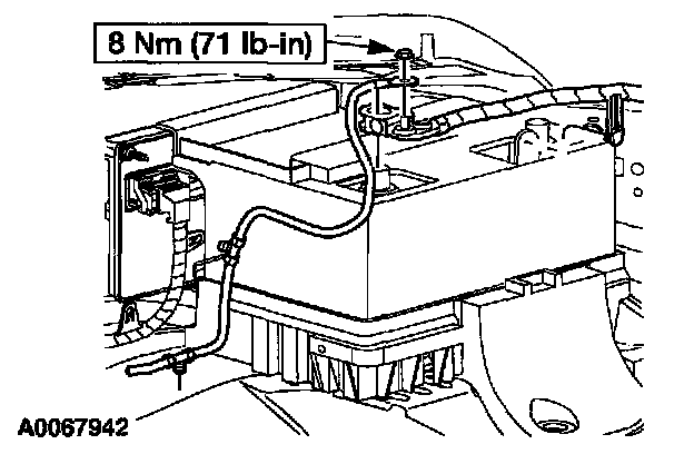 8. Remove the nut and position the battery positive cable and bracket aside.