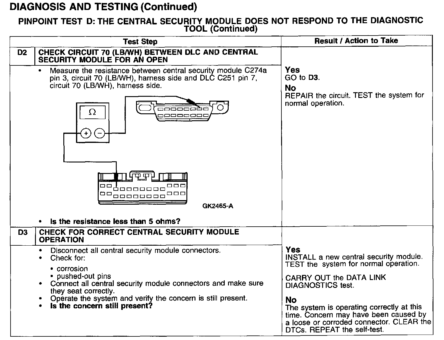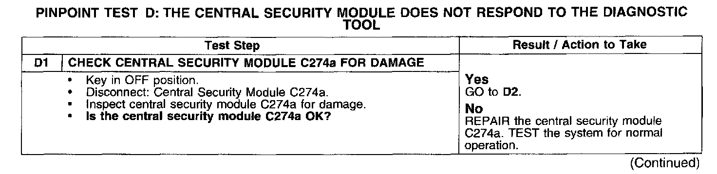 PINPOINT TEST D: THE CENTRAL SECURITY MODULE DOES NOT RESPOND TO THE DIAGNOSTIC TOOL