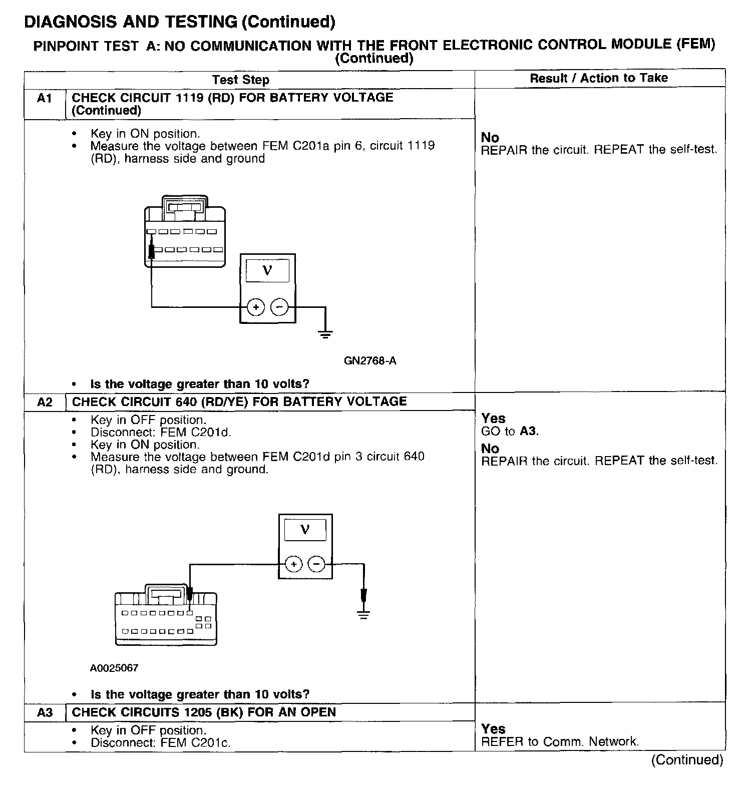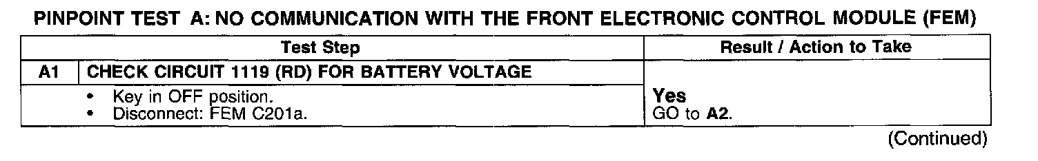 PINPOINT TEST A: NO COMMUNICATION WITH THE FRONT ELECTRONIC CONTROL MODULE (FEM)