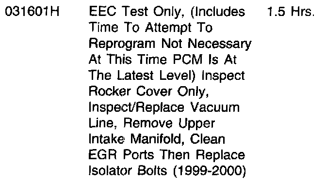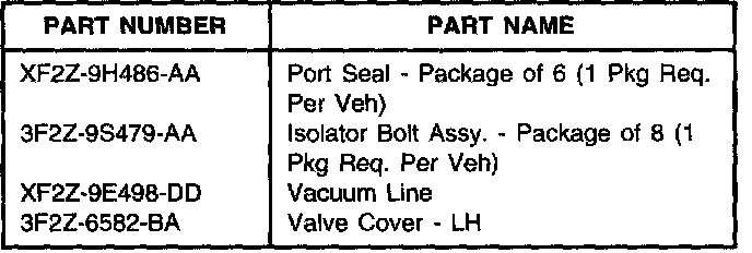 If the vacuum line from the intake manifold to the fuel pressure regulator is loose at the manifold (due to oil contamination), replace the vacuum line (9E498) and install a new design LH service valve cover (6582). Another vacuum leak source is the gasket (9H486) between the upper and lower intake manifold assemblies caused by a loss of tension at the isolator bolt assemblies (9S479) due to contamination of the rubber grommets from excessive oil pullover.