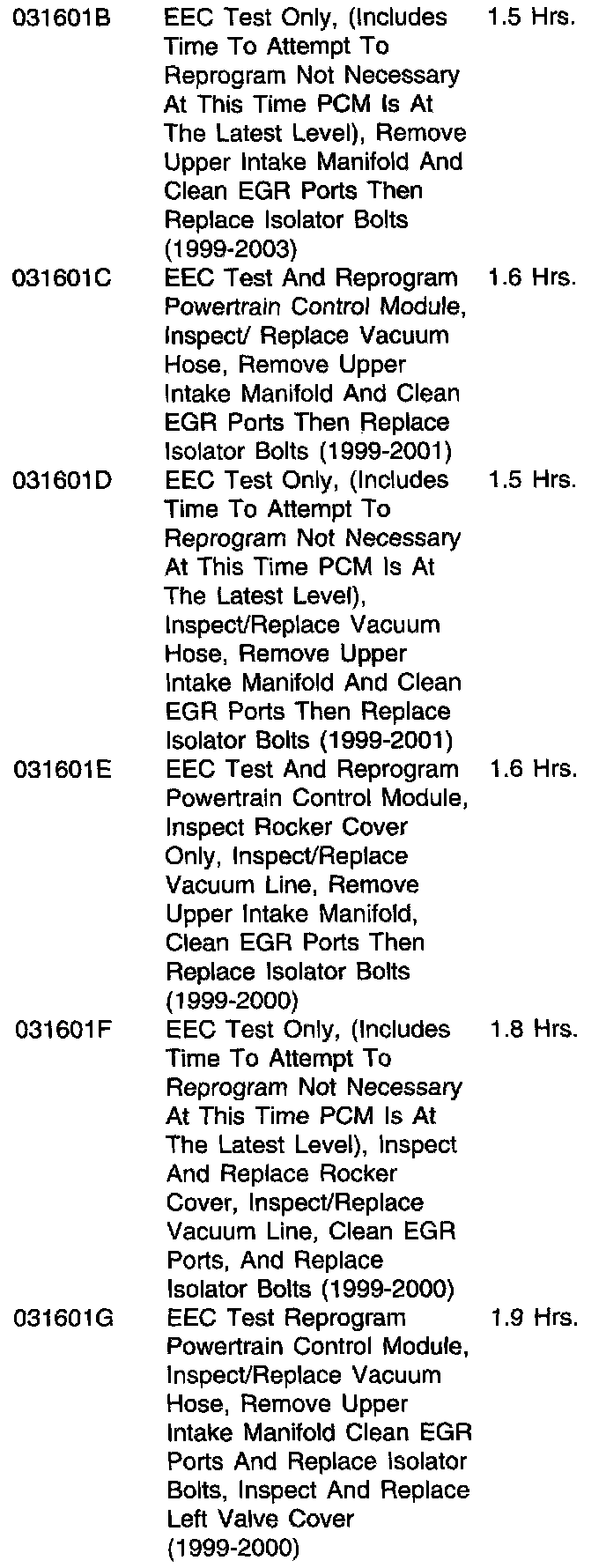 4. (1999-2000 ONLY). Inspect the LH Valve Cover, it should be a (3F2Z-6582-BA) Install a new LH Valve Cover if required, refer to Workshop Manual Section 303-01 Valve Cover-LH. (Refer to the following NOTE for description of the old style valve cover).