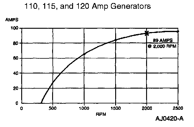 4. With the engine running at 2,000 rpm, adjust tester load bank to determine the output of the generator. Generator output should be greater than shown on the graph. If not, refer to Symptom Chart for diagnostic procedures. Symptom Related Diagnostic Procedures