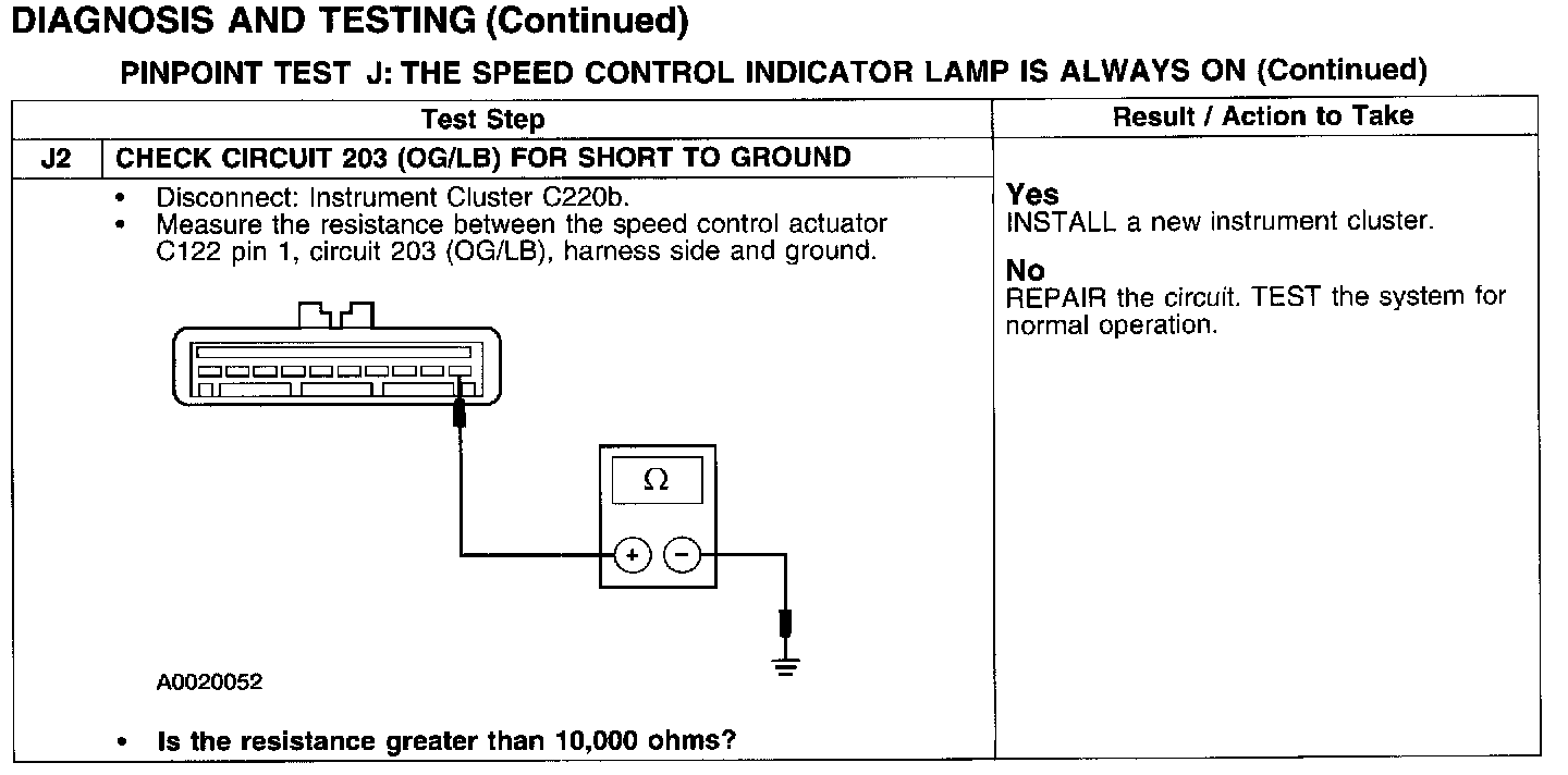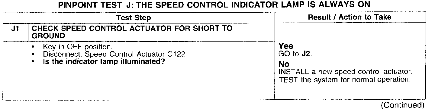 PINPOINT TEST J: THE SPEED CONTROL INDICATOR LAMP IS ALWAYS ON