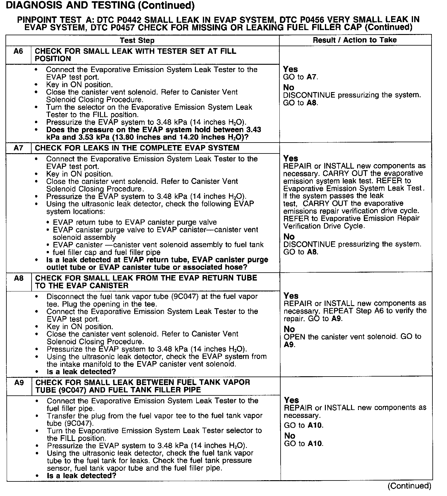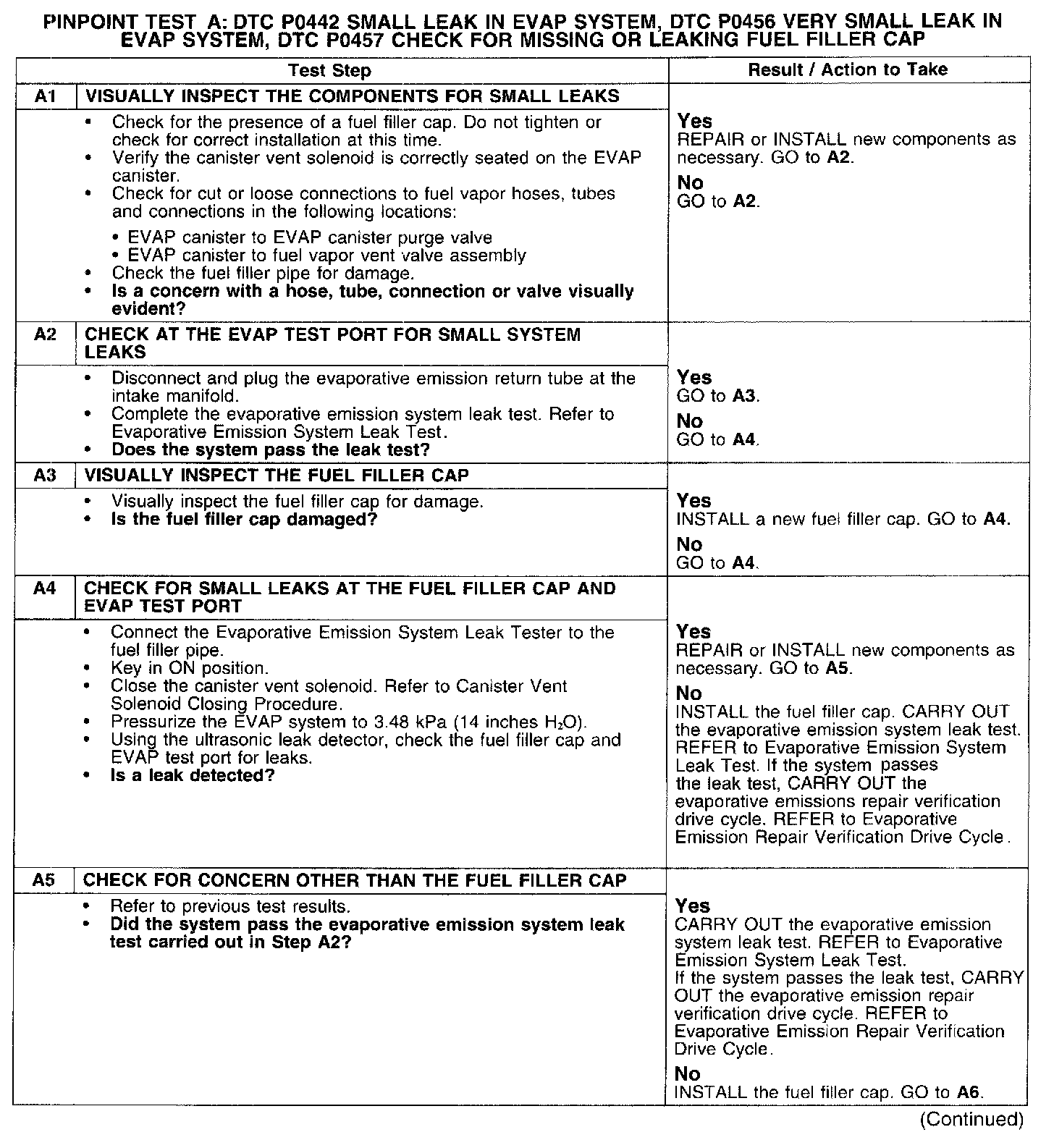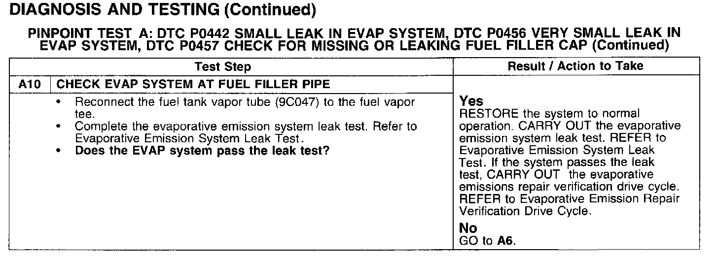 PINPOINT TEST A: DTC P0442 SMALL LEAK IN EVAP SYSTEM, DTC P0456 VERY SMALL LEAK IN EVAP SYSTEM, DTC P0457 CHECK FOR MISSING OR LEAKING
