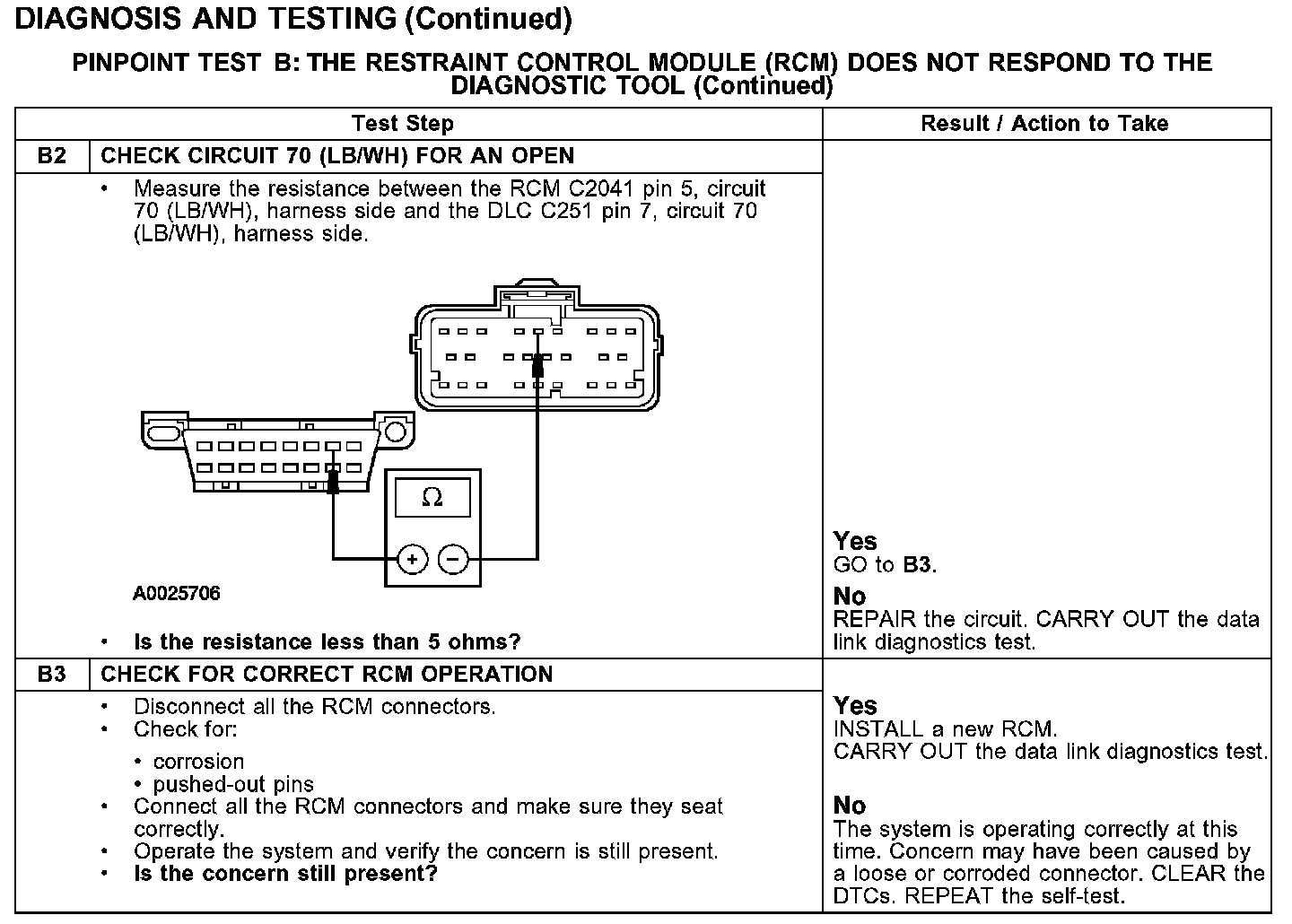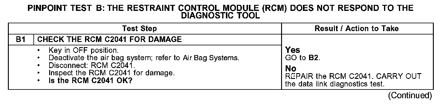 PINPOINT TEST B: THE RESTRAINT CONTROL MODULE (RCM) DOES NOT RESPOND TO THE DIAGNOSTIC TOOL