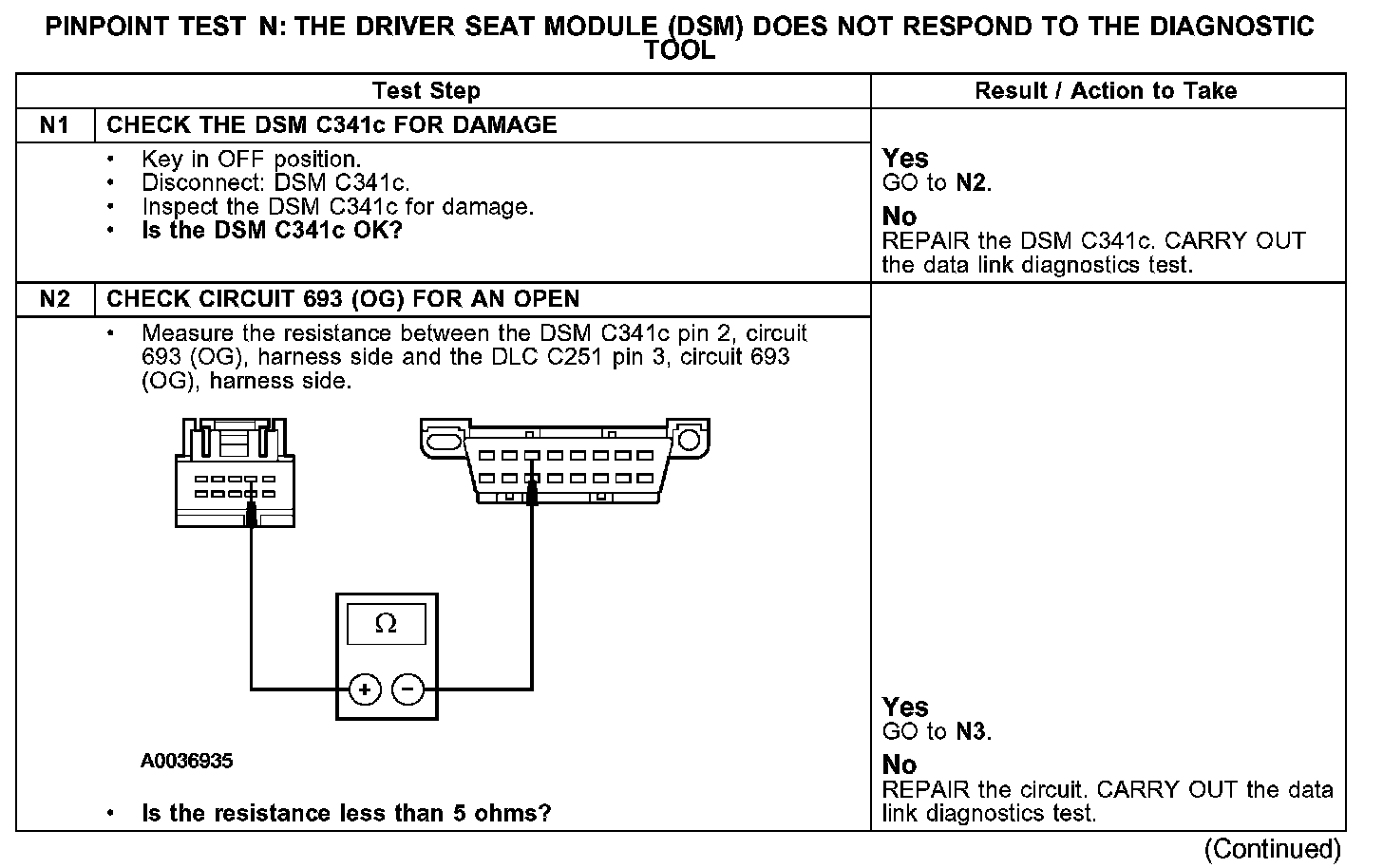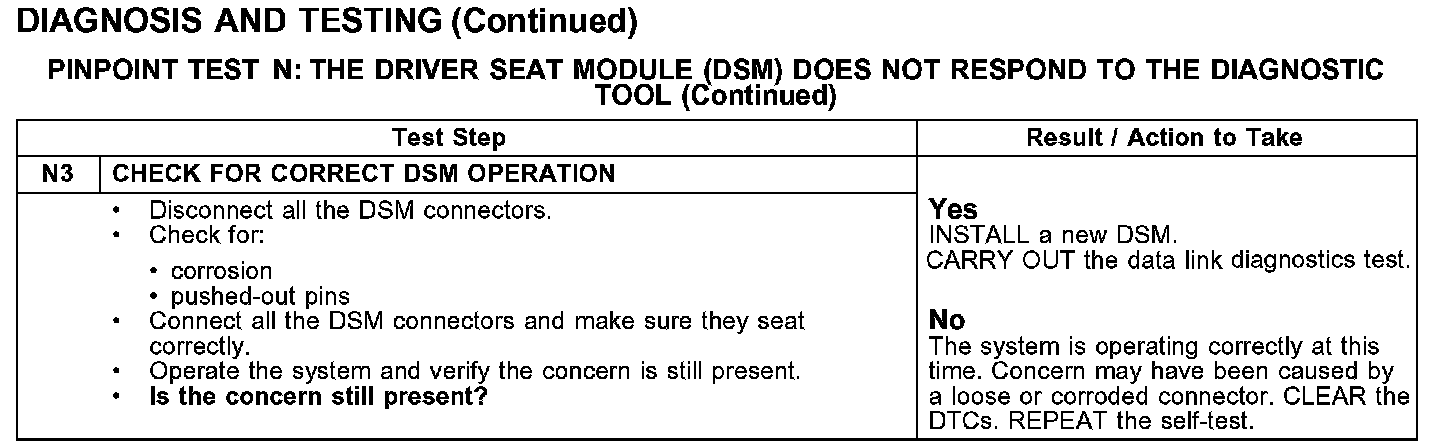 PINPOINT TEST N: THE DRIVER SEAT MODULE (DSM) DOES NOT RESPOND TO THE DIAGNOSTIC TOOL