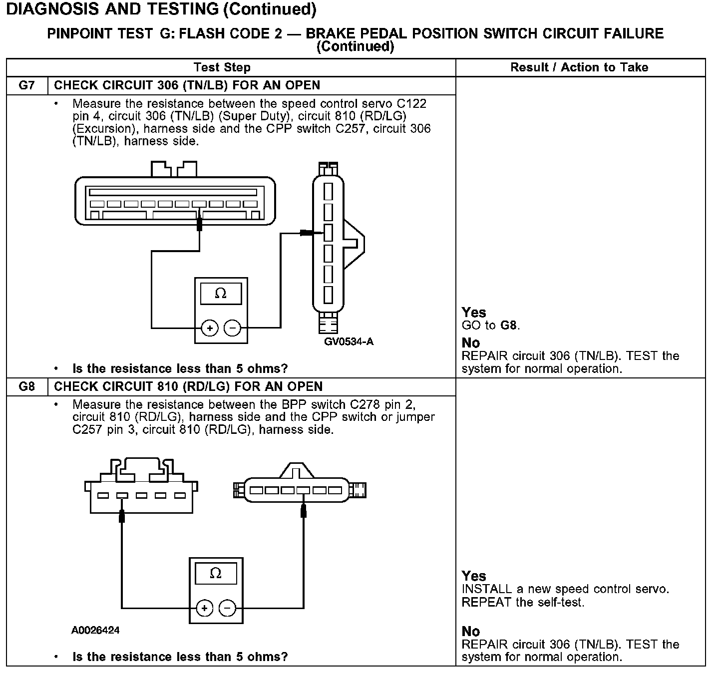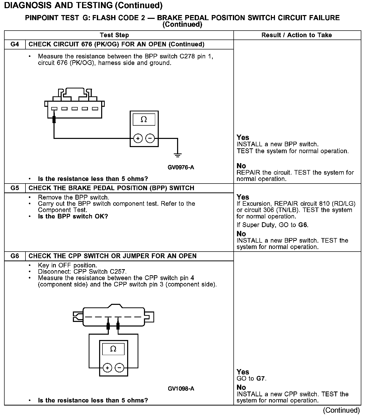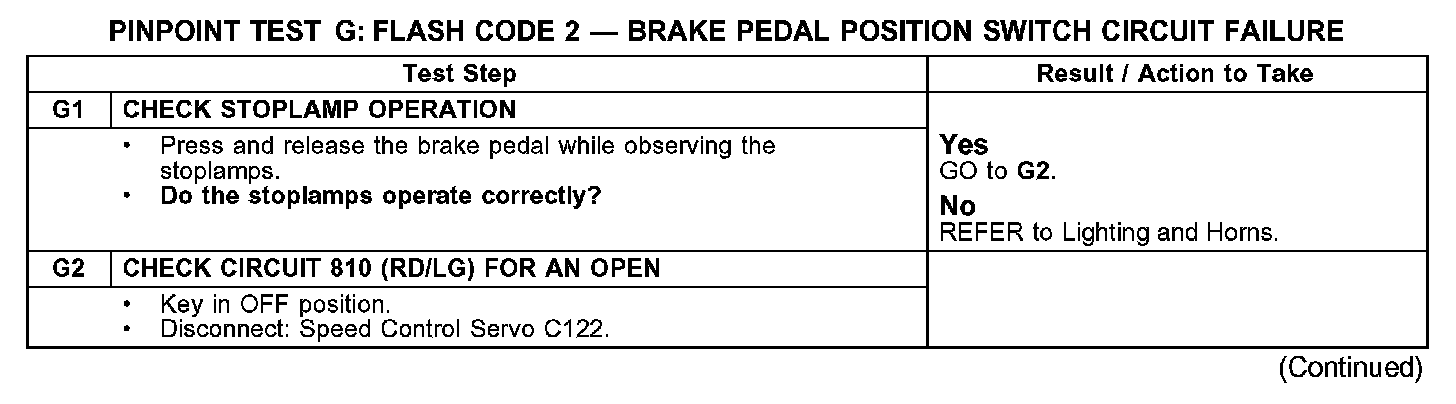 PINPOINT TEST G: FLASH CODE 2 - BRAKE PEDAL POSITION SWITCH CIRCUIT FAILURE