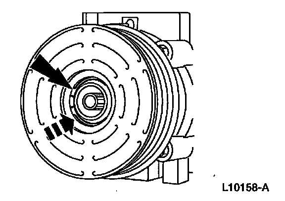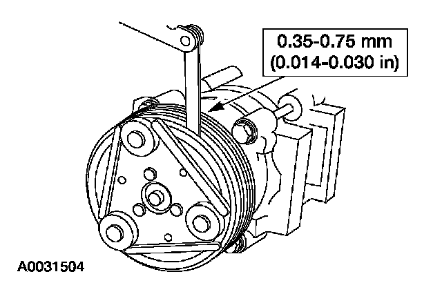 8. Measure and adjust the clutch air gap by removing or adding the A/C clutch disc and hub spacer.