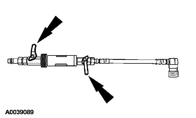 5. Install the dye/lubricant injector between the low-side service gauge port valve and the refrigerant service station or manifold gauge set.