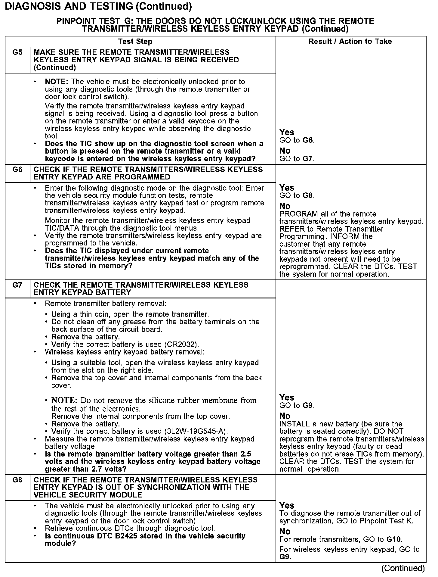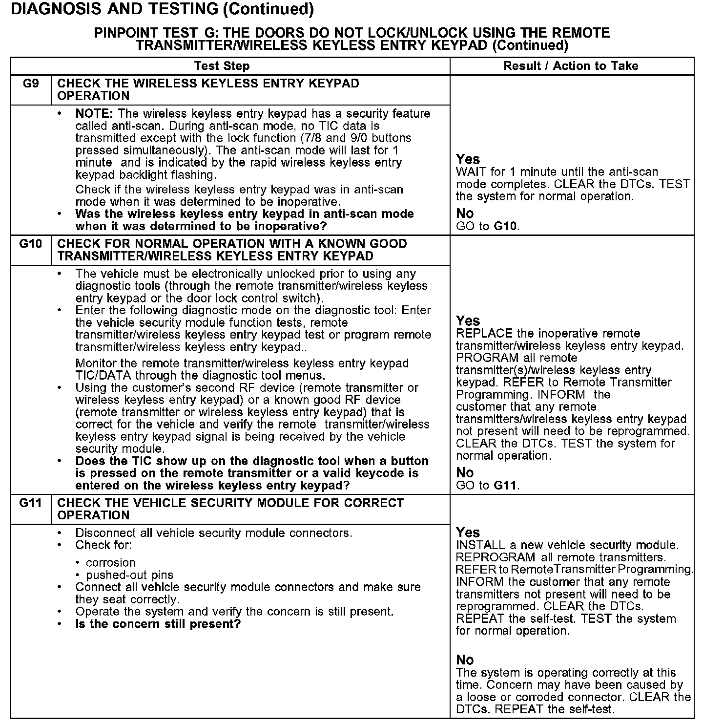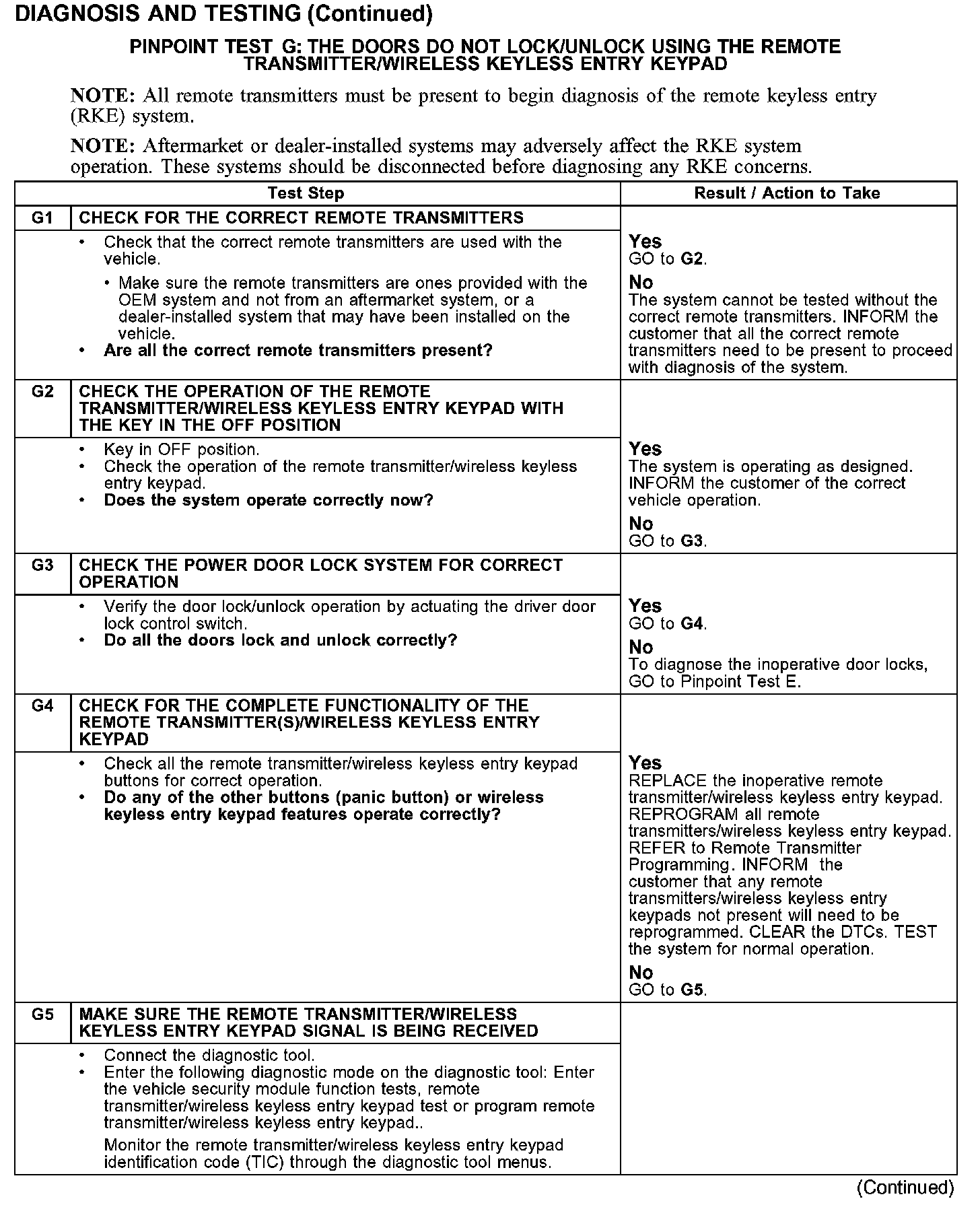 PINPOINT TEST G: THE DOORS DO NOT LOCK/UNLOCK USING THE REMOTE TRANSMITTER/WIRELESS KEYLESS ENTRY KEYPAD