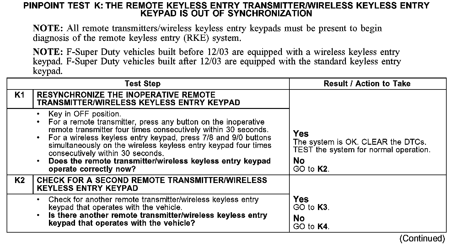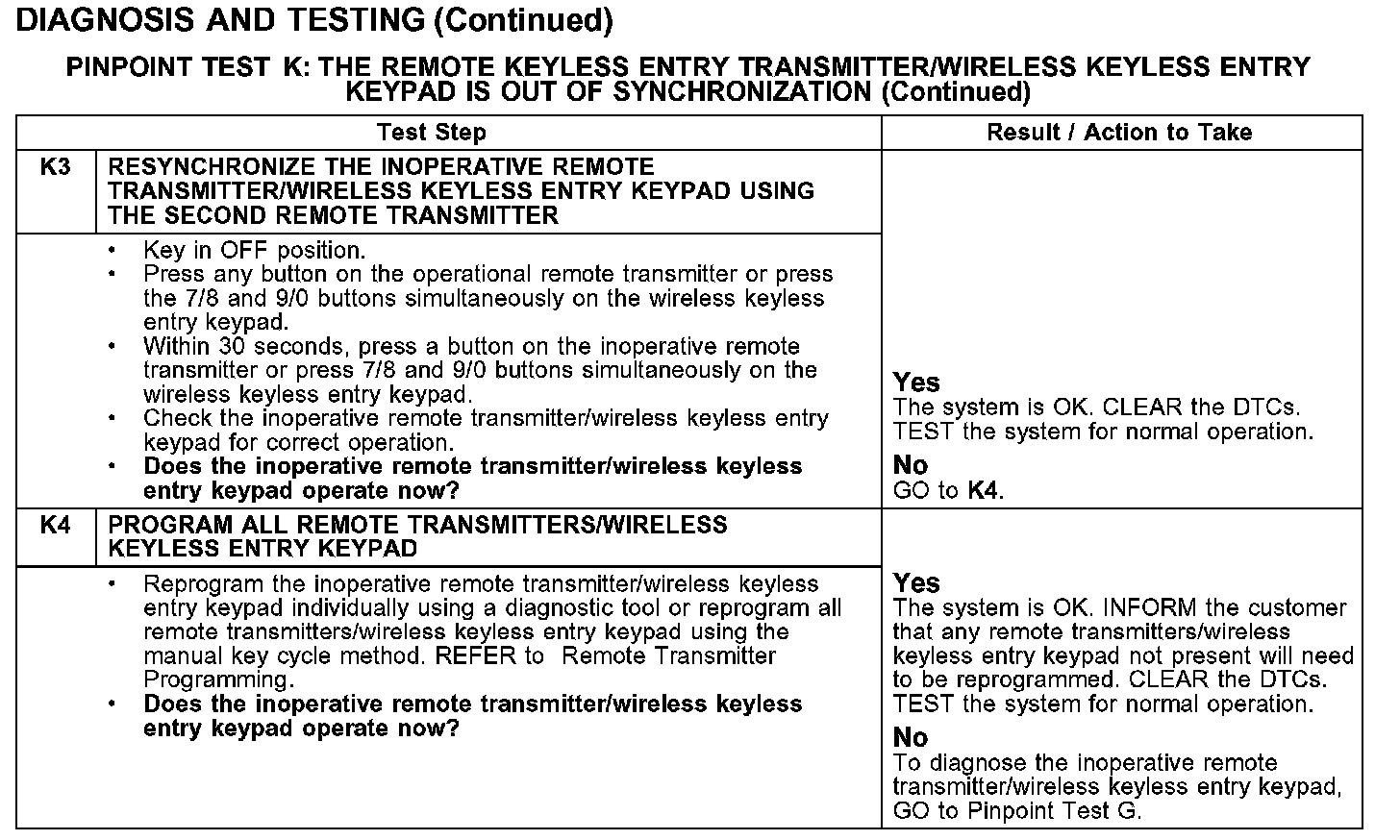 PINPOINT TEST K: THE REMOTE KEYLESS ENTRY TRANSMITTER/WIRELESS KEYLESS ENTRY KEYPAD IS OUT OF SYNCHRONIZATION