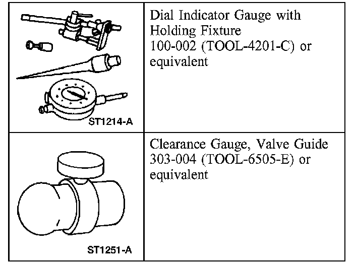 Install a Valve Guide Clearance Gauge on the valve stem and install a Dial Indicator Gauge with Holding Fixture. Lower the valve until the Valve Guide Clearance Gauge contacts the upper surface of the valve guide.