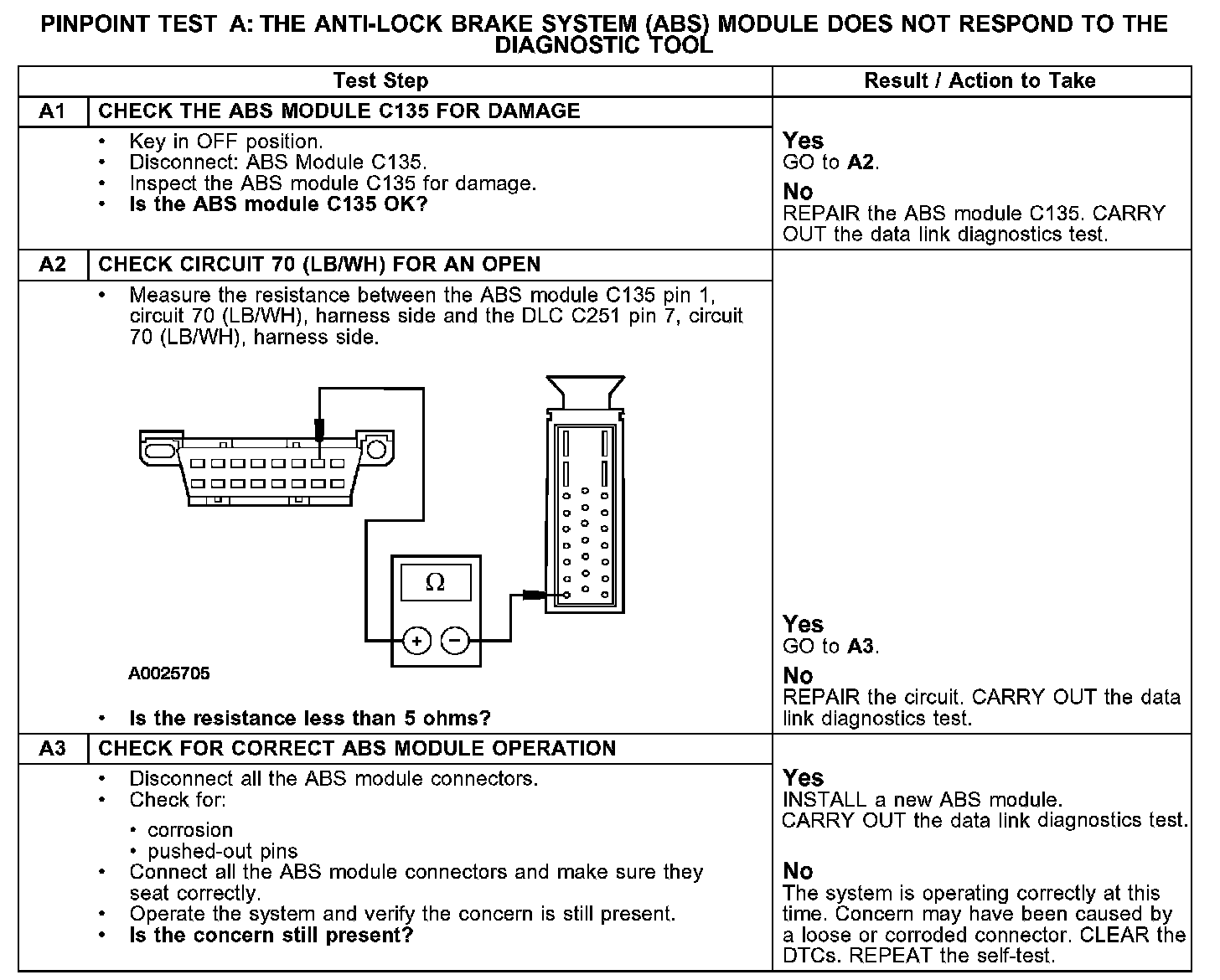PINPOINT TEST A: THE ANTI-LOCK BRAKE SYSTEM (ABS) MODULE DOES NOT RESPOND TO THE DIAGNOSTIC TOOL