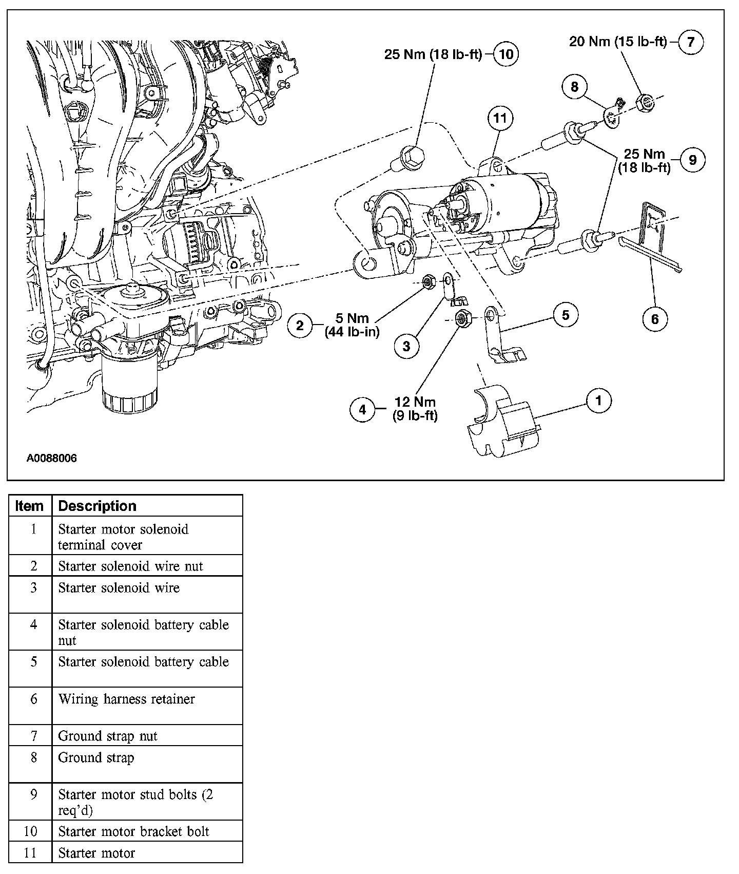 5. Remove the starter solenoid battery cable nut and position aside the cable.