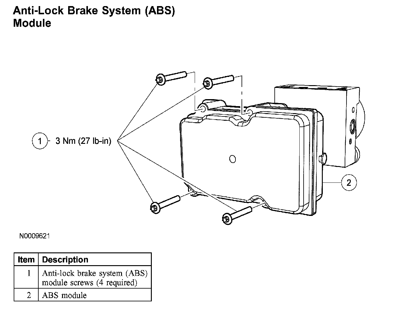NOTE: When installing a new anti-lock brake system (ABS) module, it must be configured (using vehicle as-built data) and calibrated. Follow the diagnostic tool directions for the calibration procedures. For module configuration, refer to Information Bus (Module Configuration).