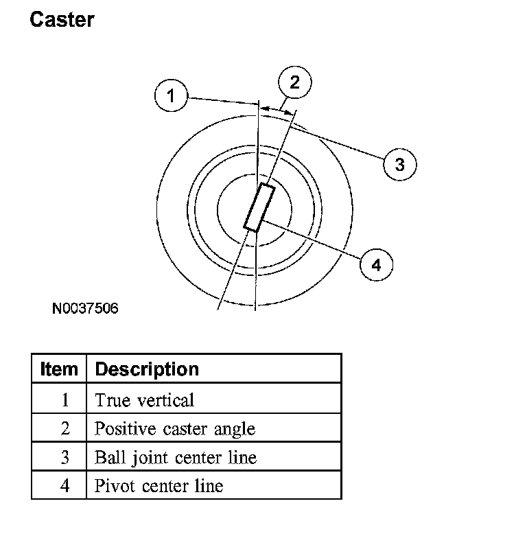 Caster is the deviation from vertical of an imaginary line drawn through the ball joints when viewed from the side. The caster specifications will give the vehicle the best directional stability characteristics when loaded and driven. The caster setting is not related to tire wear.
